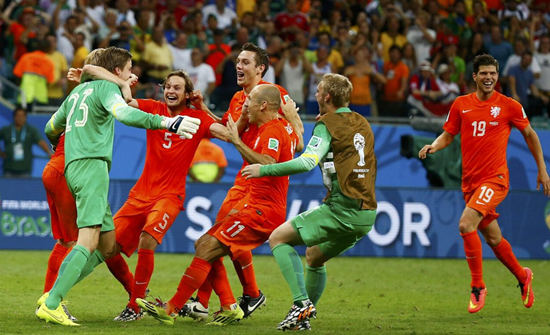 新浪體育訊 北京時間7月6日4時(巴西時間5日17時),世界杯1/4決賽最后1場在薩爾瓦多新水源球場展開較量,荷蘭與哥斯達黎加120分鐘內戰為0比0,點球決戰荷蘭4比3勝出。下半時,斯內德任意球中柱,范佩西射門也被后衛擋到橫梁上。加時賽結束前,斯內德遠射又中橫梁。點球戰,范加爾特意換上的門將克魯爾撲出魯伊斯和烏馬尼亞的點球。