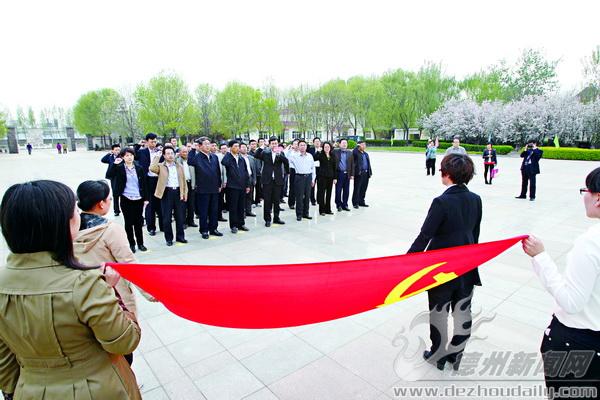 4月2日,德州市委辦公室、市委政研室、市農工辦在德州革命烈士陵園開展黨的群眾路線教育實踐活動,廣大干部職工在黨旗下重溫入黨誓詞,向人民英雄紀念碑敬獻花籃,參觀德州人民英雄紀念館并瞻仰烈士墓。 記者鄒斌攝