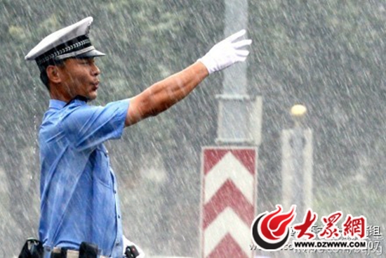 去年7月份的一天,王曰磊在經(jīng)十舜耕路口教兩個(gè)輔警打手勢(shì),眼看天就要下雨,他讓輔警先回去穿雨衣。之后,頃刻間下起了傾盆大雨,王曰磊被淋了個(gè)全身濕透。