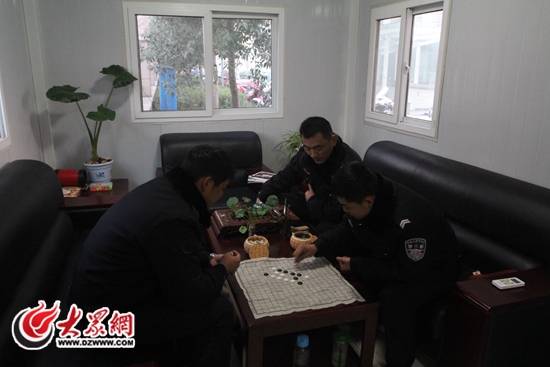 上午8:00,大眾網(wǎng)記者來(lái)到位于經(jīng)十路和舜耕路交叉口東南角的交警休息室,見(jiàn)到了剛剛執(zhí)勤完的王曰磊,他熱情地邀記者進(jìn)屋里坐。環(huán)顧這個(gè)十幾平米的小屋,門(mén)口的墻上釘了十幾個(gè)掛衣服和帽子的掛鉤,進(jìn)門(mén)右手邊是十幾個(gè)鐵皮柜子,左手邊是一張半人高的方桌,桌上擺著幾盆海棠花。再往里看,三排沙發(fā)圍著一個(gè)茶幾,茶幾上放著茶壺和茶葉,還有一張圍棋棋盤(pán),兩個(gè)休息的民警正在下棋,整個(gè)屋子干凈整潔,非常溫馨。