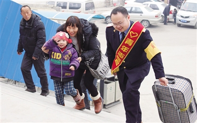 青年志愿者們還根據當地人喜歡按農歷說日期的習慣,專門制作了《春運40天農歷和公歷對照表》,張貼在所有售票窗口,并制作互聯網購票(電話訂票)流程操作卡、春運車次時刻表等便攜式宣傳資料,免費分發給過往旅客。圖為青年志愿者正在主動幫扶重點旅客進站。