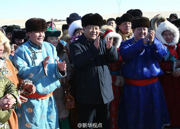 新華網北京1月27日電 據新華社“新華視點”微博報道,“草原人民歡迎您”“歡迎您到錫林郭勒來做客”……臨近中午,習近平來到當地蒙古族群眾舉行的冬季那達慕,看賽馬,聽長調,賞歌舞,牧民們爭相同總書記握手。習近平對群眾說,我向大家致以新春祝福,祝大家馬年一馬當先、萬馬奔騰、馬到成功!