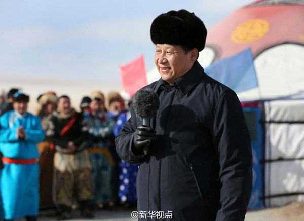 冬季那達慕活動上,習近平參加了“五畜祈福”儀式。他用無名指蘸上馬奶酒向外彈了三下,然后說,我借“五畜祈福”寓意,祝新年風調雨順,五谷豐登,草畜興旺。讓我們繼續弘揚鍥而不舍的精神,同心同德努力奮斗。祝祖國更加繁榮昌盛、各族人民更加幸福安康。