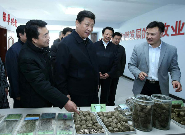 習近平來到毛登牧場飼草產業基地。桌上擺放著各種草標本和加工的草塊、草顆粒。負責人拿起針茅草說:“這種草牛羊喜歡吃,但夏天長出倒刺尖,羊吃了易刺穿皮,羊皮就不值錢了,加工成草顆粒就沒問題。”總書記笑著說:“這可是牛馬羊愛吃的香餑餑啊。”