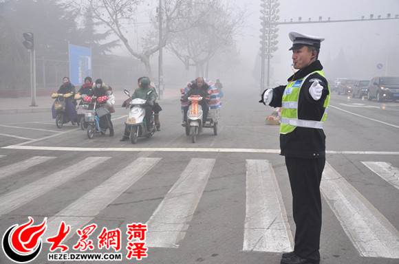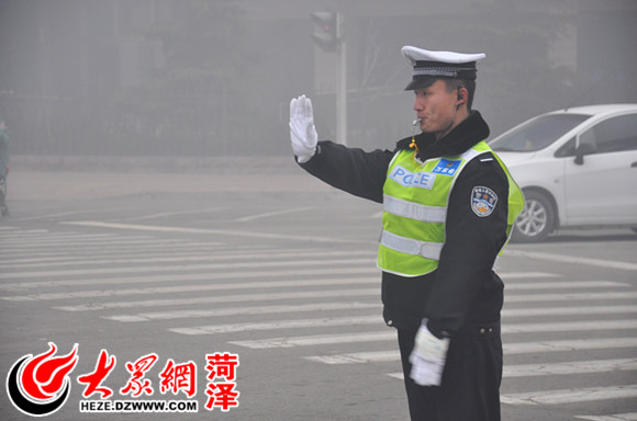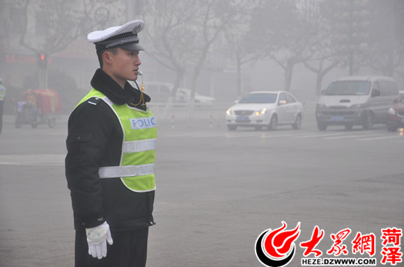 大眾網菏澤1月30日訊(記者 郭 豪)30日下午1時,大霧彌漫,萬家希換上制服,走上執勤崗,開始今天的執勤。今年是大年三十,萬家希及城區其他180名交通民警和往常一樣站崗執勤,在2014年春節前一天,他們堅持站好最后一班崗。