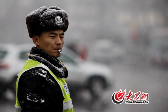 王曰磊雪天執(zhí)勤,衣帽上落滿了雪花(交警供圖)