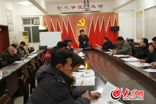章丘市雙山街道辦三澗溪村黨支部書記高淑貞帶領村民讀社區報。