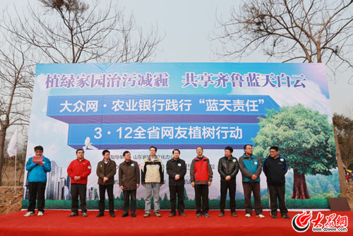 在啟動儀式上,大眾網作為主辦方致辭:“作為山東新聞第一網,大眾網自創辦以來始終熱心公益事業,把社會責任放在首位。2009年以來,大眾網攜手農業銀行山東省分行已發動數千萬網友在山東省17地市,種植樹木累計近百萬棵,為生態山東貢獻力量!苯裉,大眾網繼續攜手農業銀行山東省分行,以對抗“大氣污染”為己任,在全省17地市發動網友踐行“藍天責任”,植綠家園治污減霾,共享齊魯藍天白云。