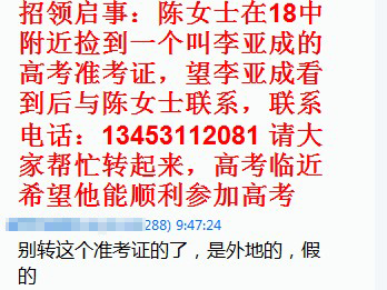 記者在百度搜索相關關鍵詞發現,許多地區都曾出現該同樣內容的QQ消息,由于高考臨近,這條消息在未經證實的情況下,被多次轉發。6日上午一上班,記者QQ所在的六七個群都轉發了該消息。類似消息有:“招領啟事:陳女士在18中附近撿到一個叫李亞成的高考準考證,望李亞成看到后與陳女士聯系,聯系電話:13453112081,請大家幫忙轉起來,高考臨近希望他能順利參加高考。”經查詢發現,該號碼屬地為山西太原。雖然獲得大量轉發,不過也有少部分人對此消息存在質疑,在群中號召群友要擦亮眼睛。