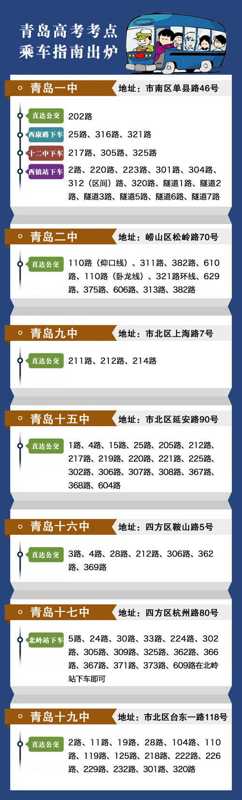 大眾網(wǎng)青島6月6日訊(見習記者 李佳寧)青島2014年高考將于明日正式開考,青島市南市北兩區(qū)共設(shè)7個考點,分布相對分散。為方便考生和家長出行,大眾網(wǎng)記者特推出考點乘車指南,希望通過乘車指南給考生和家長提供幫助。
