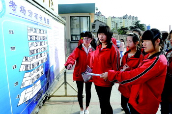 ◤今年春季高考開考前,考生來到考點了解自己的考場位置!∫娏曈浾摺纹妗z