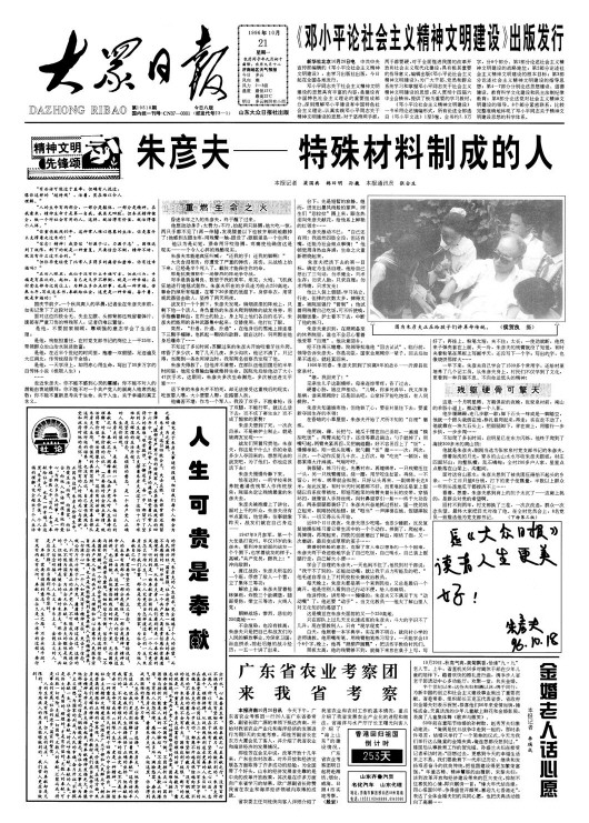1996年,本報(bào)頭版頭條刊發(fā)朱彥夫事跡報(bào)道。