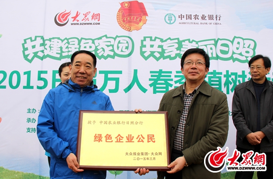 到達植樹活動現(xiàn)場后,活動首先舉辦了啟動儀式。在啟動儀式上,中國農(nóng)業(yè)銀行日照分行被授予“綠色企業(yè)公民”稱號。