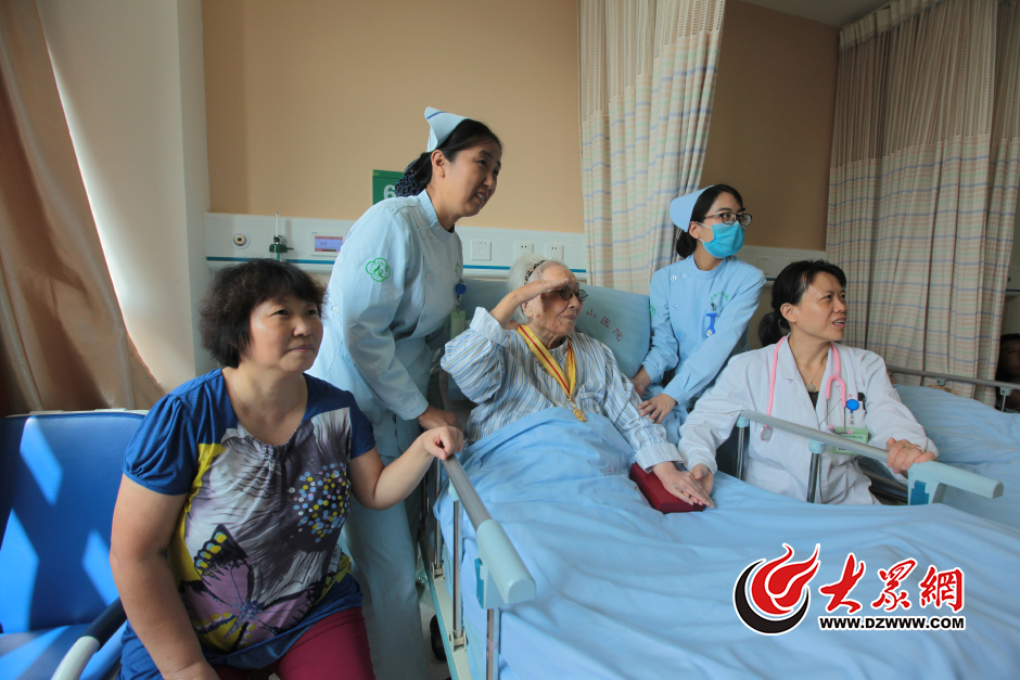 9月3日上午10點,在千佛山醫院的一間普通病房里,98歲的抗戰老兵劉芬老人面色紅潤,正與值班醫護人員共同觀看抗戰勝利70周年大閱兵現場直播。在觀看直播時,老人難掩內心激動心情,莊嚴的敬了一個軍禮。大眾網記者 王長坤 攝