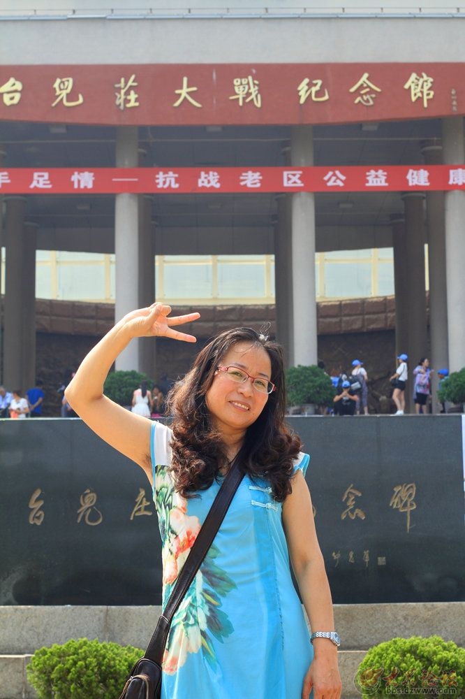 我是運河丫蛋兒,實名沈慶敏,響應大眾網“指尖護衛大閱兵”的征集令,在大眾網棗莊拍客團老茂團長的帶領下,我在抗戰圣地臺兒莊為大閱兵激情點贊!臺兒莊是抗戰圣地,中華兒女曾用血肉長城在此奮勇抗擊日本侵掠者,取得了震驚中外的臺兒莊大捷。這是民族的揚威之地,光榮之地。作為一個文弱女子,每每瞻仰一處處抗戰圣跡,總有生未逢時的遺憾。小女子也有英雄膽——崇慕英雄,護衛英雄,追隨英雄,想做英雄,花木蘭,趙一曼,江雪琴,劉胡蘭,慷慨悲歌千古傳,誰說女子不如男?!我在抗戰圣地臺兒莊,在臺兒莊大戰紀念館,在臺兒莊古城的抗戰圣跡前,為英雄的祖國,英雄的軍隊,英雄的人民,英雄的偉業,激情點贊!