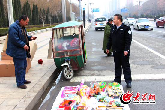 老練的范建濤并沒(méi)有被這句話噎住,“您擺在下面,有些人想買您的東西,開(kāi)車的就得在機(jī)動(dòng)車道上停車,不開(kāi)車的就得站在機(jī)動(dòng)車道上等。買東西的一想這么危險(xiǎn),還會(huì)停下來(lái)買您的東西嗎?等會(huì)我們會(huì)要求擺在下面的都搬上去,您就放心好了。”聽(tīng)了這句話,剛才語(yǔ)氣還咄咄逼人的攤主便開(kāi)始把東西往臺(tái)階上搬。由于玩具攤有點(diǎn)大,范建濤便招呼著同事一起幫攤主搬到人行道上。