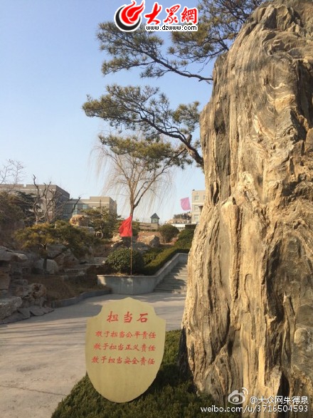一進監獄大門,就看見路邊有一塊碩大的“擔當石”,旁邊的看板上寫著三行大字:敢于擔當公平責任、敢于擔當正義責任、敢于擔當安全責任。帶班的濟南監獄黨委書記、監獄長劉敦臣告訴記者,這是所有監獄民警的座右銘。
