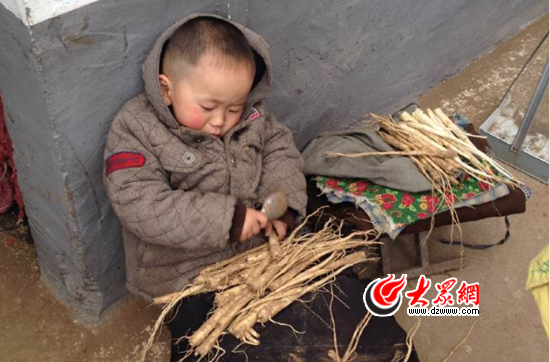 三歲的兒童給桔梗刮起皮來也有模有樣