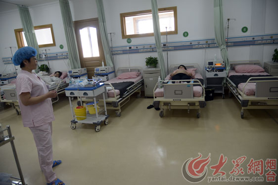 在煙臺毓璜頂醫院產房待產室中,護士們為每位孕婦檢測胎心,并注意觀察孕婦情況,保障每位孕婦可以在生產前達到最佳狀態。