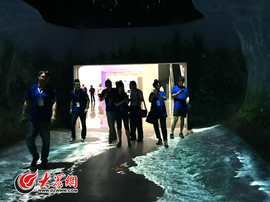 采訪團記者走在海洋通道上,3D技術(shù)投射的波浪讓人身臨其境,流連忘返。記者 馬俊驥 攝