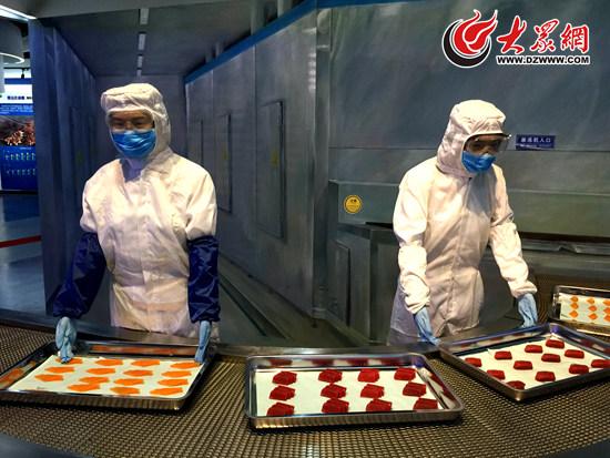 在榮成市海洋食品博覽中心的試吃體驗區(qū),采訪團記者們合影留念。記者 馬俊驥 攝