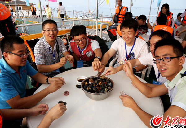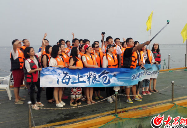大眾網榮成8月16日訊(記者 孫晨)青山碧海、水天一線,成群結隊的海鷗,一望無際的養殖場。今天下午“海上糧倉·全國網絡媒體山東海洋行”采訪團記者來到鴻泰桑溝灣海洋牧場,開啟海中漁家樂休閑體驗之旅,親身體驗“海上采摘”。