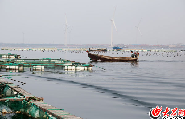 今天下午,采訪團記者們從桑溝灣碼頭乘坐漁家木船開啟海上休閑體驗之旅。漁船在碧藍的大海上緩慢前行,船后翻滾著白色的水花,岸邊的漁船、風車在視線中漸漸消失,一條條浮萍鏈也慢慢的出現在眼前,成群結隊的海鷗,你追我趕的搶奪著游人拋撒在海中的食物。隨行的桑溝灣海洋牧場劉經理告訴我們,漁民常年“吃穿住”在海中漂浮的房屋中,他們日出而作,日落而息,牧海而耕。劉經理稱,因地理位置優越、天然水質優良,海產品產量高、品質佳,桑溝灣出產的扇貝,曾作為國宴用品招待過美國前總統尼克松。