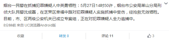 大眾網煙臺5月27日訊 5月27日14時50許,煙臺市公安局萊山分局刑偵大隊民警沈成磊,在芝罘區幸福中路對犯罪嫌疑人實施抓捕中受傷,經搶救無效犧牲。目前,市、區兩級公安機關已成立專案組,正在對犯罪嫌疑人全力追捕中。