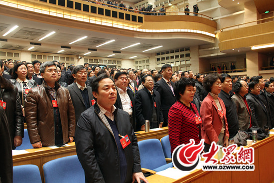 1月26日上午9時,中國人民政治協商會議第十一屆山東省委員會第三次會議在濟南隆重開幕。圖為全體政協委員起立唱國歌。大眾網記者 馬俊驥 攝