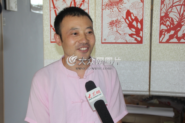 國(guó)家級(jí)非物質(zhì)文化遺產(chǎn)剪紙項(xiàng)目傳承人李金波接受大眾網(wǎng)記者采訪。