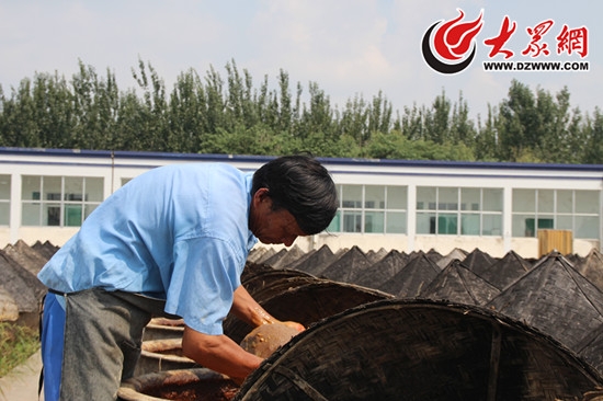 9日上午,大眾網記者來到了位于山東省濟寧市濟鄒路上的玉堂醬園生產基地。3000余只醬缸整理的排列在釀曬場上,今年61歲的老師傅張廣民告訴記者,只有用保持了三百年的傳統工藝,才能釀造出獨居風味的玉堂醬菜,每一缸、每一包醬菜都要在這里經過至少半個月的自然釀曬、人工翻倒。