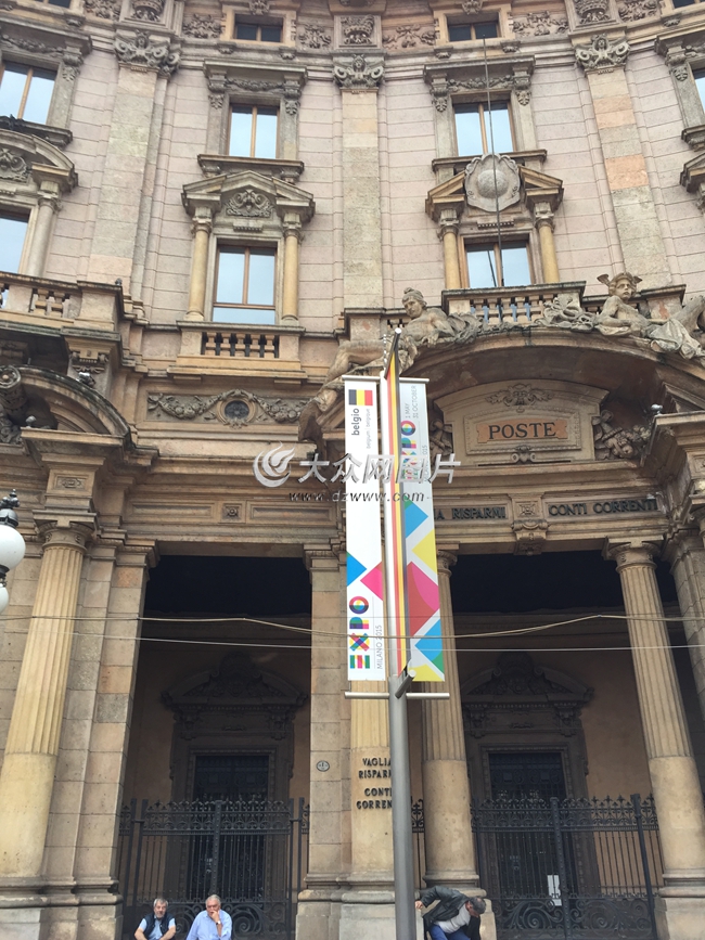 米蘭市區一家郵局前懸掛著世博會旗幟。