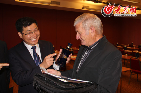 山東景芝酒業(yè)品牌總監(jiān)李亦民向海外媒體記者介紹一品景芝。