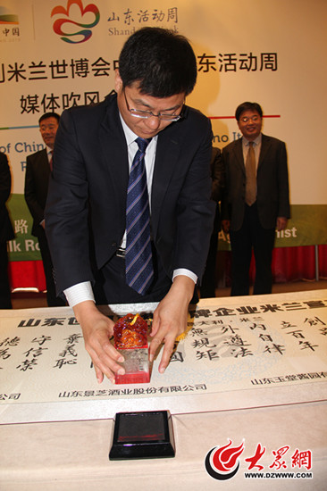 山東景芝酒業(yè)品牌總監(jiān)李亦民在《米蘭宣言》上蓋印,承諾誠(chéng)信經(jīng)營(yíng),嚴(yán)把質(zhì)量關(guān)。