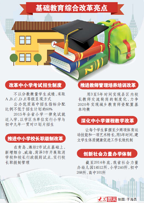 2014年年底,推進基礎(chǔ)教育綜合改革的意見正式出臺。截至目前,20個配套文件中的17個已陸續(xù)頒布,標志著我省基礎(chǔ)教育立體化綜合改革頂層設(shè)計大致完成。本次改革強調(diào)市域統(tǒng)籌和整體推進,鼓勵基層首創(chuàng)和大膽實踐,為山東教育改革按下快進鍵。