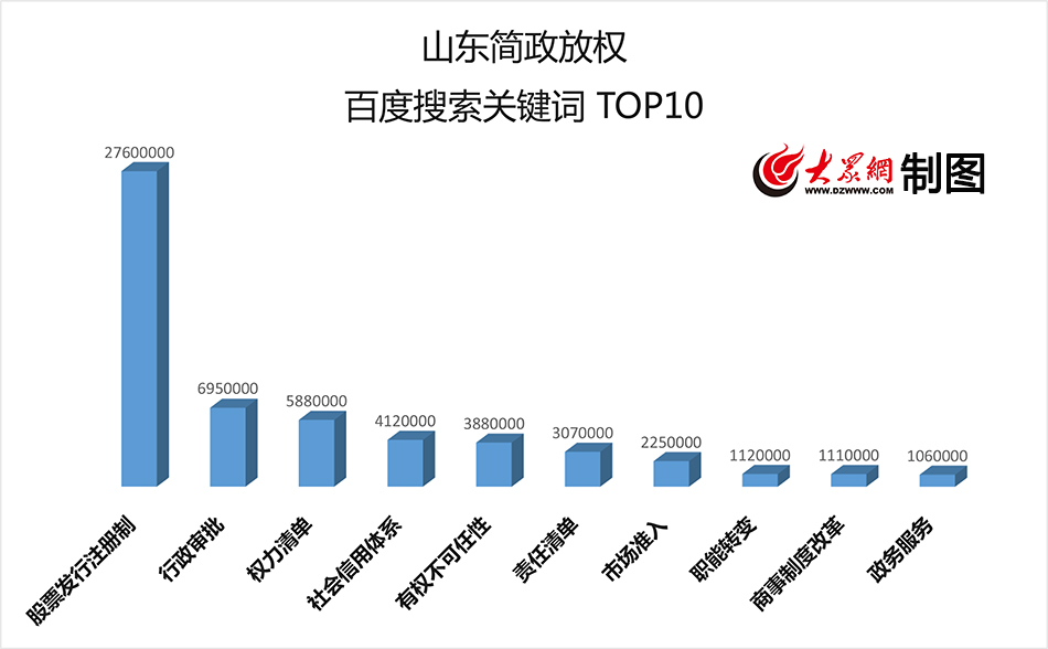 根據(jù)分析,“股票發(fā)行注冊制”是網(wǎng)友搜索最多的“熱詞”,搜索量達到2760萬次;“行政審批”和“權(quán)力清單”則分別以695萬和588萬的搜索量名列第二位和第三位。除此之外,“社會信用體系”、“有權(quán)不可任性”、“責任清單”、“市場準入”、“職能轉(zhuǎn)變”、“商事制度改革”、“政務(wù)服務(wù)”等以106萬到412萬不等的搜索量位居第四到第十位。