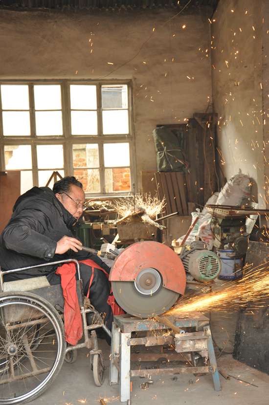 結(jié)合自己多年坐輪椅的切身體會,孫啟梅嘗試研發(fā)一種既可以放低椅背躺下休息,又可以方便出遠(yuǎn)門的電動輪椅助力車。有的時(shí)候,為購買一個零件,他會開著自己改裝的手控三輪車跑很遠(yuǎn)的路;有的時(shí)候,為切割一段鋼管,他得搖著輪椅在車間里來回穿梭十幾趟;有的時(shí)候,為撿起掉在地上的零件,他要鉗子、鉤子并用嘗試好幾次。一些對于常人來說非常簡單的事情,孫啟梅卻需要用5、6分鐘甚至更長時(shí)間才能完成。即使這樣,他的研發(fā)熱情也絲毫沒有減退。