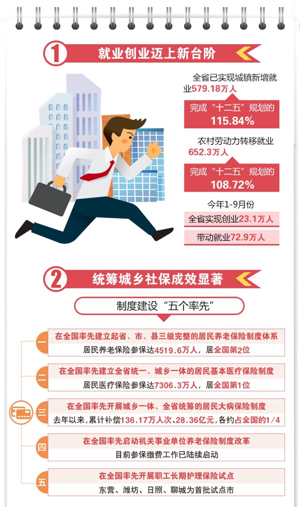 “十二五期間尤其是十八大以來,我省緊緊圍繞群眾最關(guān)心、最直接、最現(xiàn)實的利益問題,攻堅克難,砥礪奮進(jìn),密集出臺一項項惠及民生的好政策,用諸多‘率先’‘首創(chuàng)’和‘破冰’等改革關(guān)鍵詞定義民生改革‘走在前列’!笔∪肆Y源社會保障廳廳長韓金峰說。一系列“民生難點”變成“改革亮點”,一幅幅溫馨的圖景在齊魯大地展開,讓山東百姓能夠充分共享改革發(fā)展的“紅利”。