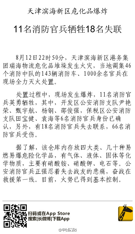 公安部消防局微博消息:天津濱海新區危化品爆炸中,11名消防官兵犧牲18人失聯,已經有6名消防官兵身份確認。另有66名消防員受傷。