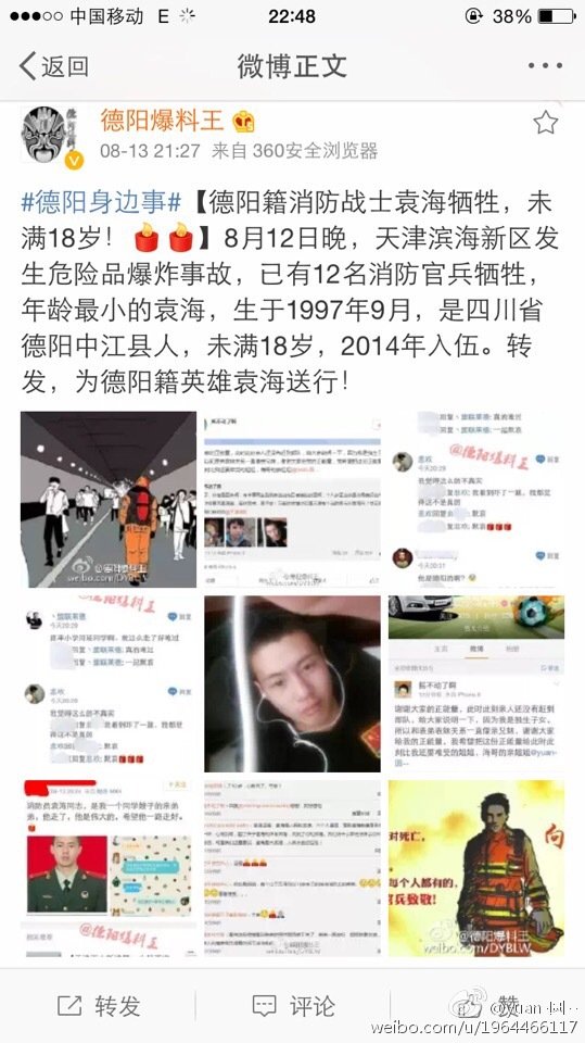 在袁海姐姐的微博里,還留存著她送弟弟參軍時(shí)的照片,以及得知弟弟前往救援,最終犧牲的全過(guò)程。8月13日上午,她寫道:“天津港,我弟弟服役的消防部隊(duì)所在的區(qū)域,他們肯定要上前線救援,電話打起是暫時(shí)無(wú)法接通,愿天佑我弟,愿天佑我弟,愿天佑我弟(重要的事說(shuō)三遍)”。
