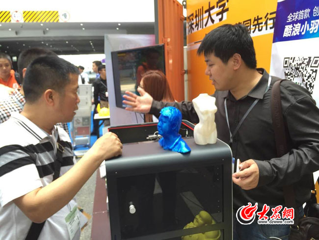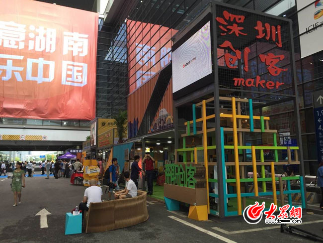 在 1號館和2號館之間的深圳創客區域,還有8個由集裝箱改造的藝術裝置。大眾網記者在該展區看到,里面展示的是以深圳大學生創意園為主體的大學生創客作品。據了解,該空間由深圳大學聯合深圳職業技術學院、中國科學院深圳先進技術研究院等高校及科研院所合力打造,不但匯集了創客車庫、意空間X-Space創客咖啡、國際創客生態平臺、夢想集裝箱等,還展示了深圳大學近幾年的創客作品。