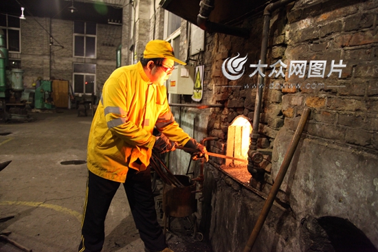 大眾網記者真切的感受到“鐵匠”這份活真是不好干:靠近烘爐邊,熱浪迎面襲來,烘爐旁師傅的臉被爐火烤的通紅。烘爐旁空氣錘下火星四濺,旁邊“小心燙傷”的提示顯得格外醒目。