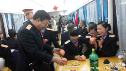 @大眾網:2月18日20:05,李建國老師到達餐車,與備勤的乘務員們一起聚餐迎新春。今年即將退休的他最后一次為年輕乘務員們派發蘋果,祝愿她們年年歲歲,平平安安!