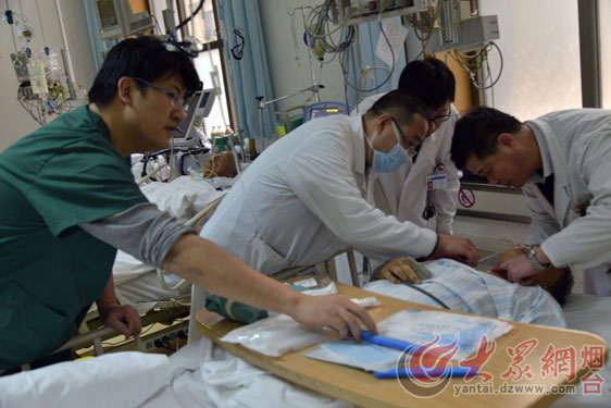 中午12點,煙臺毓璜頂醫院急診科內的患者人數漸漸少了下來,這時候急診科內的醫護人員們開始一個個的輪流吃飯,為了不影響工作,每個人都吃的很快,有的醫護人員因為工作繁忙甚至連午飯都沒吃上。在煙臺毓璜頂醫院急診科ICU病房門前,記者透過玻璃窗發現,病房中的4名護士,有的正在用毛巾為病房中的患者擦著身體,有的正在為患者做著檢查。煙臺毓璜頂醫院急診科ICU病房護士長、主管護師孫海宏告訴記者,“住在這個病房里的患者,都是一些重癥患者,為了防止交叉感染,是不允許家屬長時間陪同的。正因為這一點,ICU病房的護士除了要做平常的醫療護理工作以外,還要照顧患者的日常生活,為患者喂飯、翻身,并定期為患者擦拭身體、清潔頭部。”