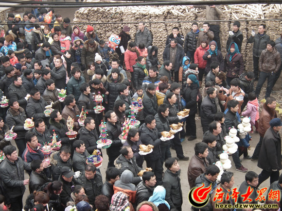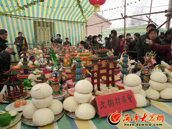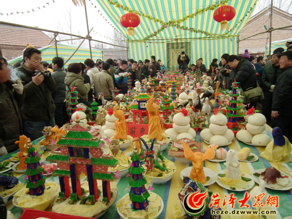 大眾網(wǎng)菏澤2月16日訊(記者 陳 翔)今天上午,由曹縣桃源集后西街主持的具有五百年多年歷史的曹縣桃源集“花供”會隆重舉行。本次“花供”會共擺出7道花供,吸引了上萬人觀看。