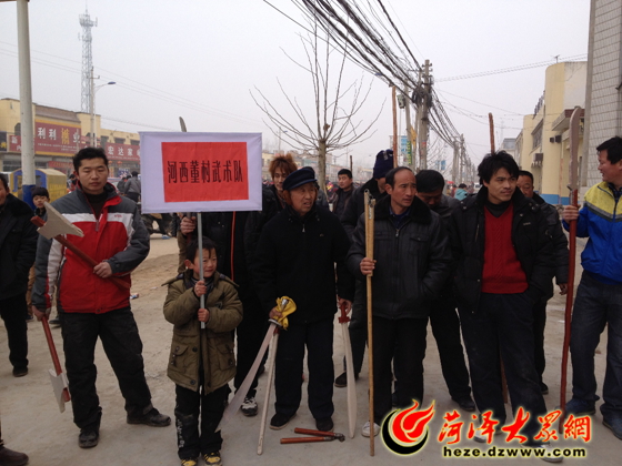 在表演的隊(duì)伍里,一支來自河西董村的武術(shù)隊(duì)吸引了數(shù)百名群眾駐足觀看,練拳、舞刀弄槍、踢腿、翻跟斗……從最小的6歲到最大的68歲,一時(shí)間老的少的, 各種花樣輪番上陣,引來了陣陣叫好聲。據(jù)了解,他們學(xué)的是夕陽拳,教他們的是夕陽拳當(dāng)代傳人董傳現(xiàn),是位遠(yuǎn)近聞名的“武林高手”,已經(jīng)義務(wù)教學(xué)30多年了,弟子達(dá)400多人。
