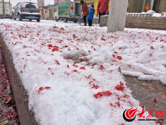 紅色的鞭炮紙散落在積雪上,顯得格外地喜慶