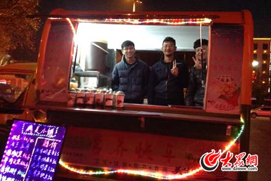 小趙和他的高中同學,現在是來自全國各地的大三學生。他們元旦期間便放了寒假,之后陸續回到平陰,在商討一番后,決定干一件"大事"--提前感受創業的艱辛和收獲。他們投資了3萬塊錢,買了一輛小貨車,然后將它改裝成餐車,用來制作奶茶、炸雞、漢堡等。每天他們開著餐車到縣城繁華的地段叫賣,生意不錯。