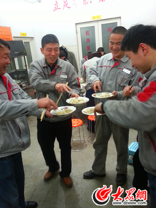 晚上7點,兩位出門處理供暖問題的值班人員回來了,一進門,還沒放下手中的工具,兩盤香噴噴的餃子便端到眼前。兩人洗把手,就這樣站在辦公室內大口吃起餃子。