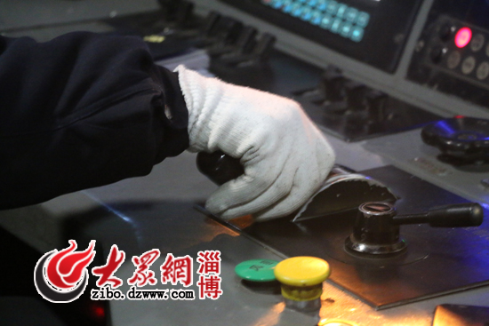 薛海濤駕駛的火車沒有電腦控制,只能是人工操作,掛檔、剎車、控制好時速。鳴笛、提手柄、呼喚應答……列車行駛在路上后,薛海濤一直忙個不停。記者眼中復雜的步驟,在薛海濤手里卻是十分嫻熟而連貫,從淄博開往泰安,184公里的路程,是他26年鐵路生涯中最為熟悉的路線。